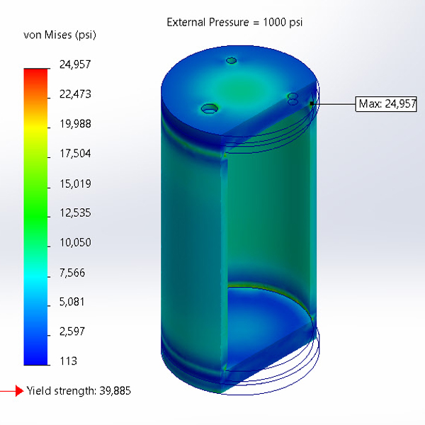 Pressure Vessel FEA. External Pressure = 1000 PSI (6.9 mPa)