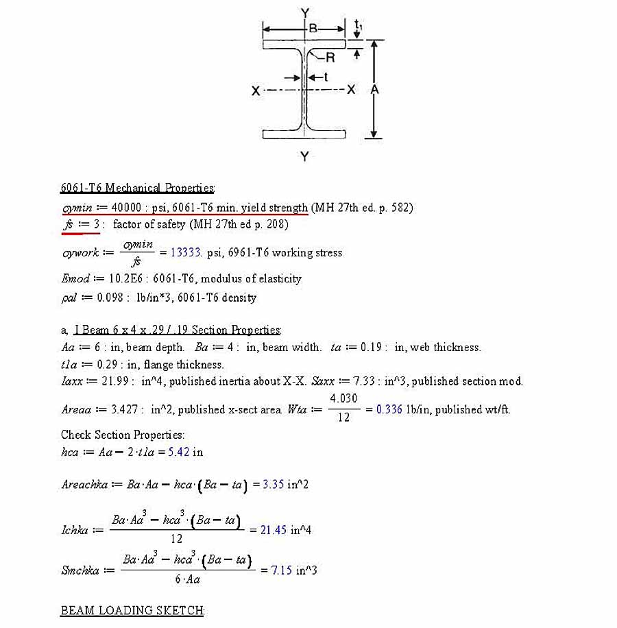 The I-Beam stress analysis shown below is used to calculate the maximum allowable load that can be supported by two (2) 6 x 4